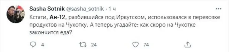 Самолет Ан-12, перевозивший продукты из Якутска в Иркутск, потерпел крушение во время захода на посадку. На борту находились семь человек, все они погибли. СМИ сообщили, что разбившийся самолет эксплуатировался 53 года. Эта информация вызвала бурные обсуждения в социальных сетях.