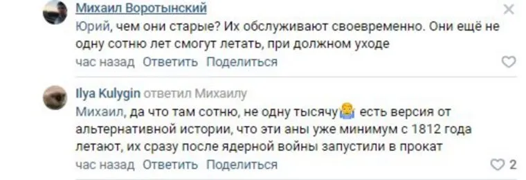 С ним оказались солидарны пользователи социальных сетей. Некоторые отметили, что следователям не стоит искать причины авиакатастрофы — по их мнению, ничего другого от самолета, который летал более 50 лет, ожидать не стоило. Пользователи окрестили Ан-12 «инновационным дроволетом» и пошутили, что они летают «как минимум с 1812 года».