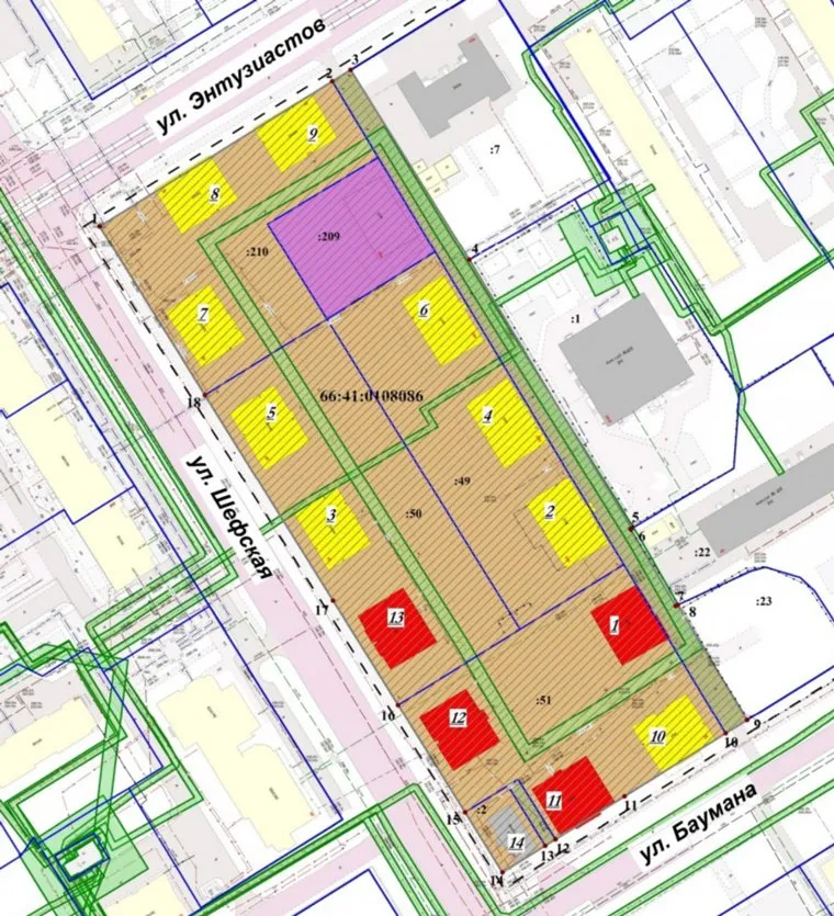 «Площадки <…> расположены в кварталах, где строились дома для рабочих Уралмаша и Эльмаша во время и после Великой Отечественной войны. На участке улиц Баумана, Шефской и Энтузиастов расположены 13 жилых домов 1941—1950 годов постройки, четыре из них признаны аварийными. На участке улиц Донбасской, Черниговского и Суворовского переулков находятся десять двухэтажных жилых домов, построенных в 50-х годах, два из них признаны аварийными», — говорится в сообщении.