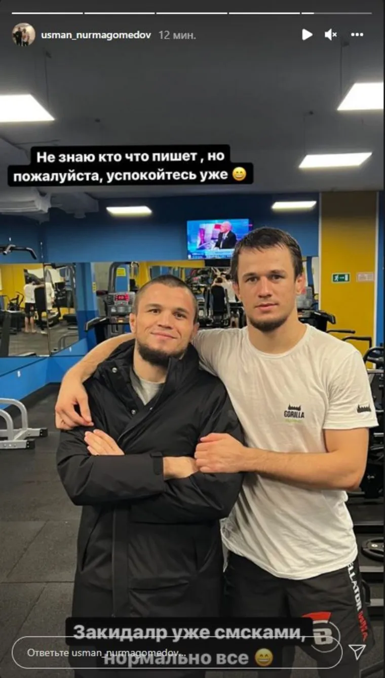Обновлено 19:25: Усман Нурмагомедов опроверг информацию о своем задержании. «Не знаю кто что пишет, но пожалуйста, успокойтесь уже. Закидали уже смсками, нормально все», — написал он на своей странице в Instagram (деятельность запрещена в РФ). В сторис Нурмагомедов выложил кадры из тренажерного зала.