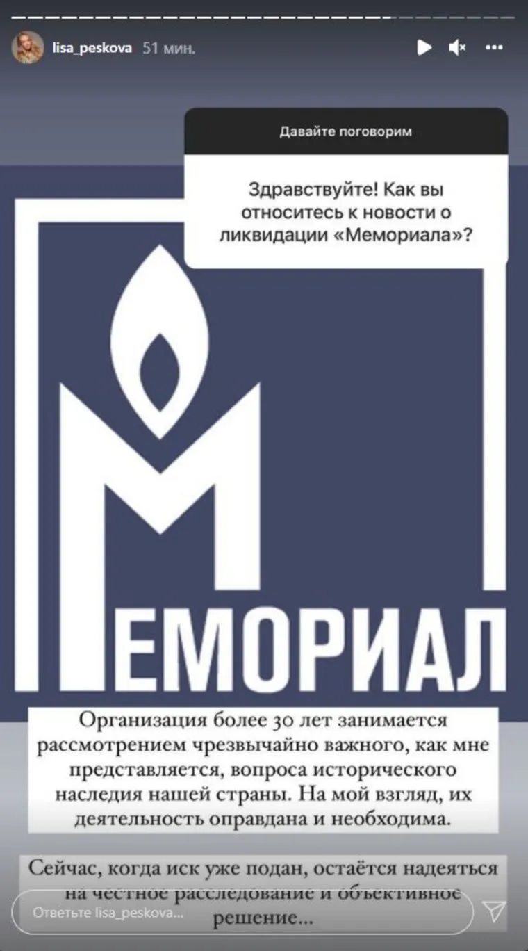 «[„Мемориал“] более 30 лет занимается рассмотрением чрезвычайно важного, как мне представляется, вопроса исторического наследия нашей страны. На мой взгляд, их деятельность оправдана и необходима. Сейчас, когда иск уже подан, остается надеяться на честное расследование и объективное решение», — написала Елизавета Пескова на своей странице в Instagram (деятельность запрещена в РФ).