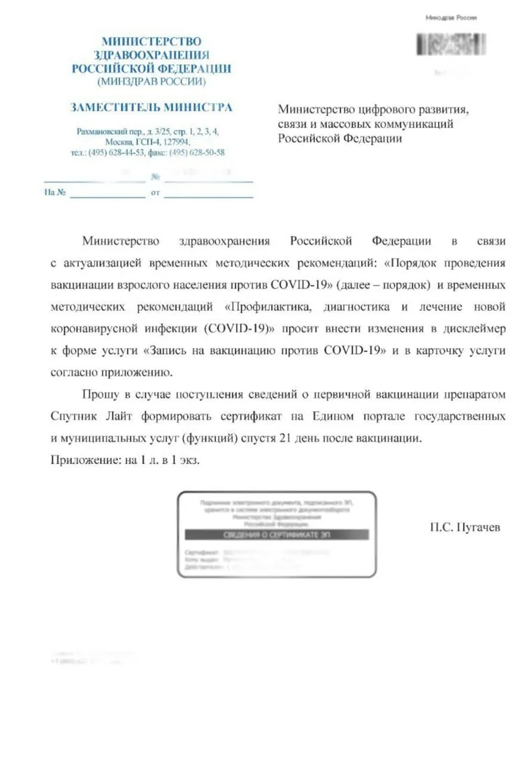 К сообщению приложен документ от Министерства здравоохранения РФ. В нем ведомство просит Минцифры РФ внести изменения в «дисклеймер к форме услуги „Запись на вакцинацию против COVID-19“ и карточку услуги» в связи с актуализацией временных методических рекомендаций. В соответствии с ними, QR-код у привитых «Спутником Лайт» должен формироваться спустя три недели после введения препарата.