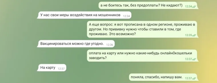Сертификат и QR-код, по словам продавца, появятся на госуслугах. При этом оплату принимают только после того, как человек убедится, что его «провакцинировали». Деньги предлагают перевести на карту, и обмана не опасаются. По словам Александра, у него есть «свои методы воздействия на мошенников».