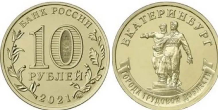 «Банк России 18 ноября 2021 года выпускает в обращение памятные монеты номиналом 10 рублей серии „Города трудовой доблести“. На монете „Екатеринбург“ (каталожный № 5714-0076) расположено рельефное изображение фрагмента памятника Уральскому добровольческому танковому корпусу; по окружности имеются надписи: вверху — „Екатеринбург“, внизу, на ленте, — „Города трудовой доблести“», — сказано в сообщении.