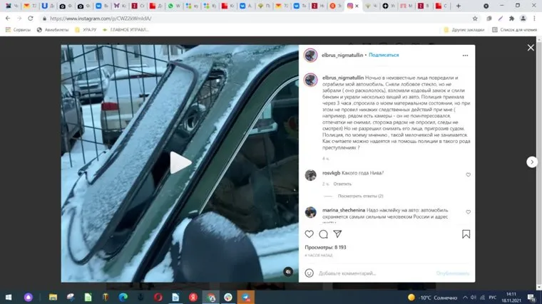 «Приехал в гости в Челябинск. И неизвестные ночью как минимум час громили мою машину. Пытались снять стекла, которые треснули. Много чего было украдено по мелочи, всего и не вспомнишь сразу. Например, украли складной нож или электронасос», — сообщил URA.RU Нигматуллин.