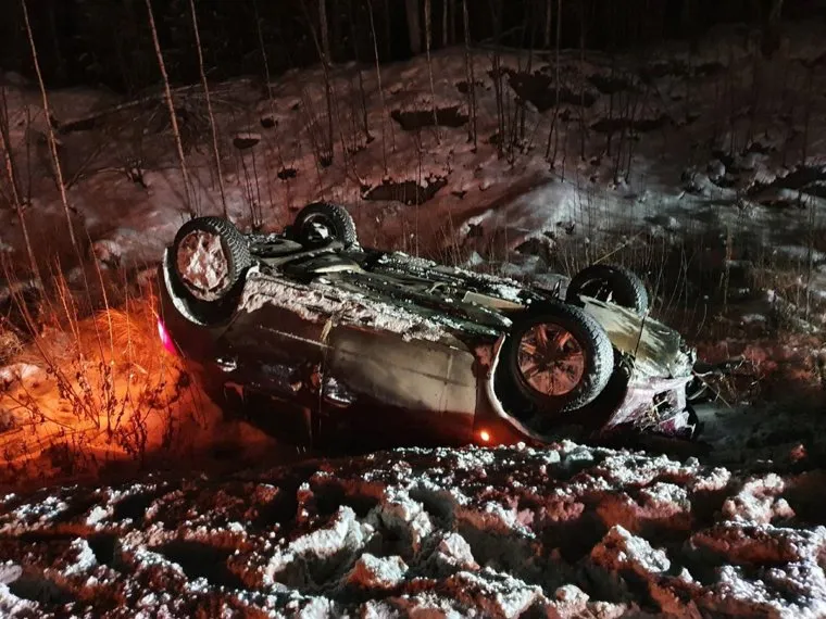 «На трассе гололед! Не далеко от поворота на Новоуральск девушка на автомобиле съехала с дороги в кювет и перевернулась на крышу. К счастью все обошлось, сработали подушки безопасности, девушка выбралась из машины самостоятельно», — пишут подписчики паблика «Екатеринбург-Серов»