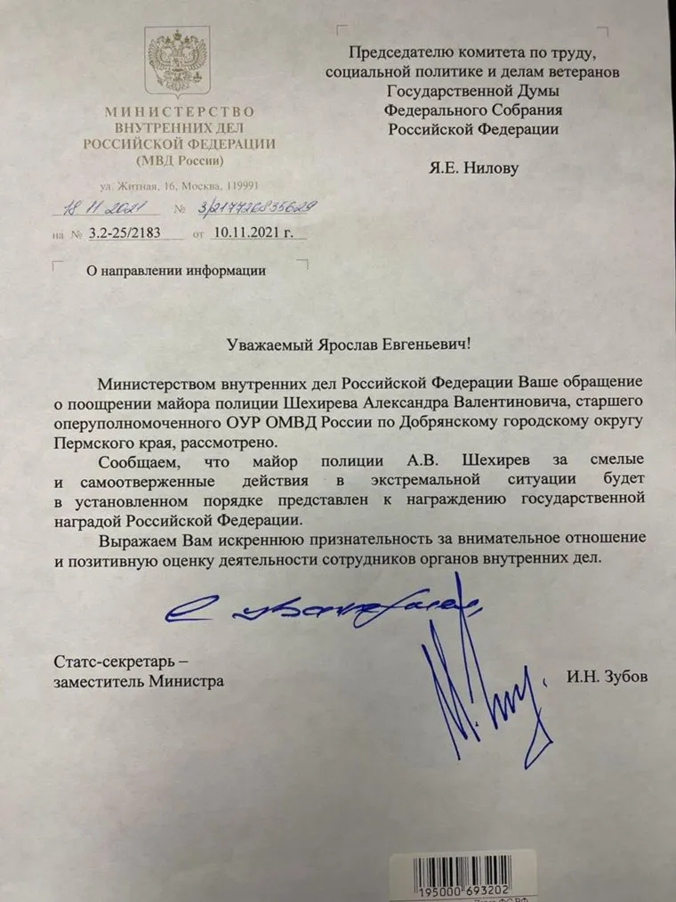 «Майор полиции Шехирев за смелые и самоотверженные действия в экстремальной ситуации будет в установленном порядке представлен к награждению государственной наградой РФ», — сказано в ответе МВД РФ. URA.RU рассказывало, что майор полиции находился на службе на трассе Пермь-Березники, в тот момент, когда фура, стоявшая на возвышенности, начала скатываться на встречную полосу.