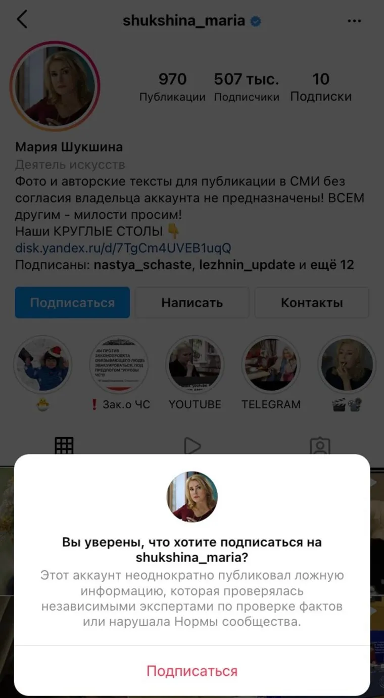 Перед подпиской на страницу Шукшиной появляется предупреждение