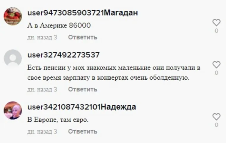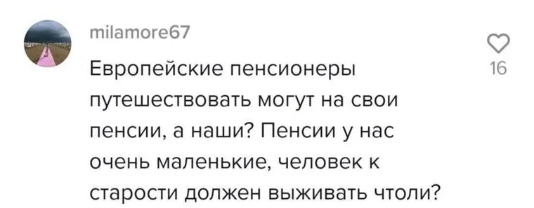 Пользователи соцсети ТикТок заявили, что пенсионеры в Европе могут путешествовать, а в России маленькие выплаты. Люди в комментариях высказались, что не могут откладывать с зарплаты деньги на старость. Другие комментаторы предложили заводить счеты в банках, как в Китае.