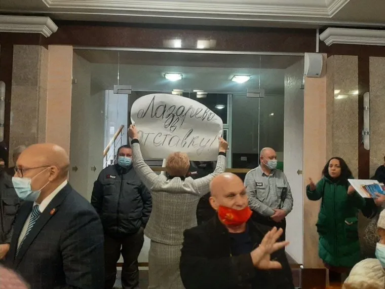 В ответ мужчина начал кричать, что решать, ходить на митинги или нет, это его право. Его соратники в этот момент развернули плакаты с требованием отставки спикера заксобрания Александра Лазарева. В здание приехала полиция.