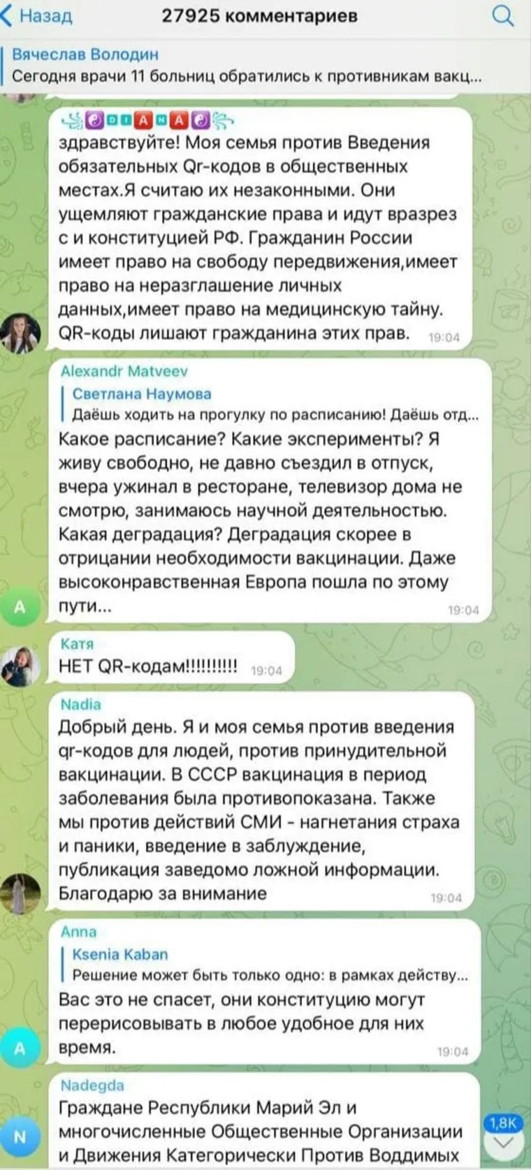 В комментариях пользователи пишут, что «их семьи» против введения QR-кодов в общественных местах и транспорте, но не против самой прививки от коронавируса. Пост был опубликован 24 ноября, за сутки он набрал 560,8 тысяч просмотров.