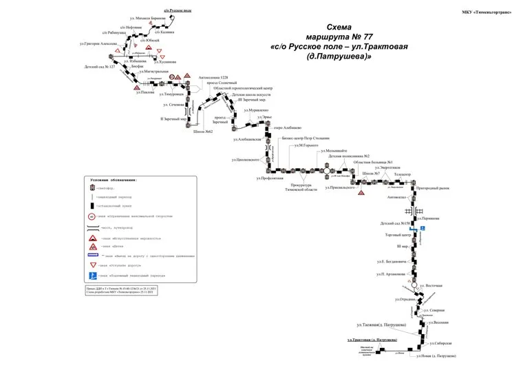 «В схему движения маршрута регулярных перевозок № 77 „с/о ‚Русское поле‘ — ул. Трактовая (д. Патрушева)“ включаются в прямом и обратном направлении остановочные пункты „ул. Григория Алексеева“ и „с/о ‚Нефтяник‘, в маршрут № 6 ‚ЖК ‚Апрель‘ — с/о ‚Степное‘ остановочные пункты ‚ул. Григория Алексеева‘ и ‚с/о ‚Нефтяник‘ включаются по направлению в сторону ‚с/о ‚Степное‘“, — сообщает портал „Тюмень — наш дом“.