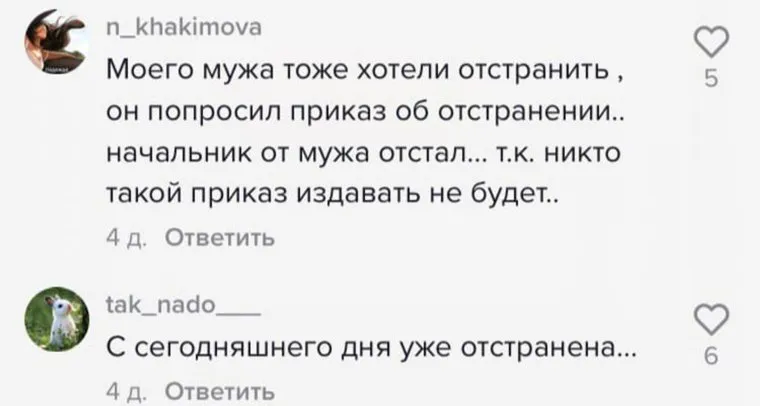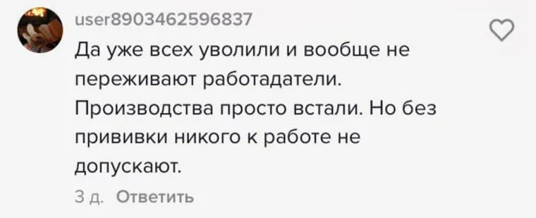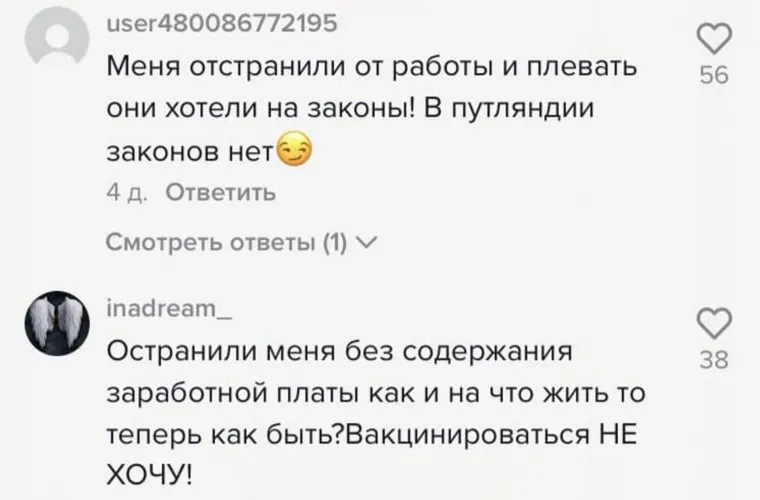 Пользователи соцсети TikTok заявили, что на работе некоторых из них отстранили из-за отказа вакцинироваться от коронавируса. Комментаторы сообщили, что работодатели не хотят платить штрафы, поэтому находят причины для отстранения.