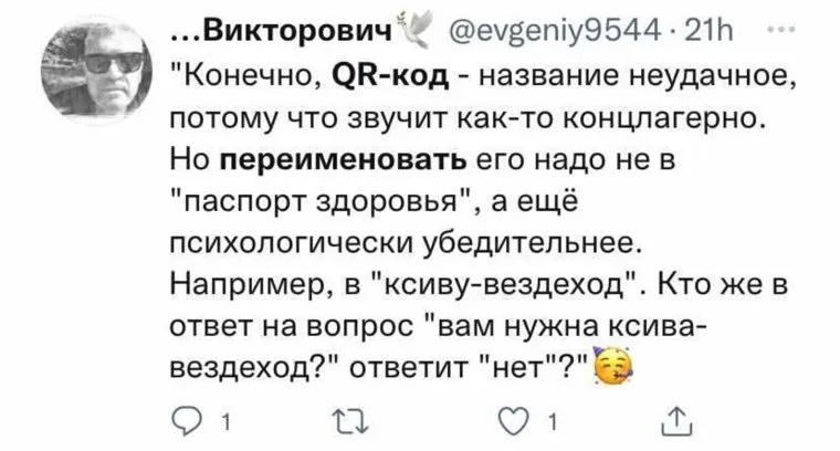 «В Кремле и правительстве обсуждают возможные названия документа, по которому привитые от коронавируса, официально переболевшие и имеющие медотвод от вакцинации граждане смогут посещать общественные места при введении ограничений из-за эпидемии коронавируса. Власти планируют свести к минимуму использование термина „QR-код“ в публичной риторике», — сообщал РБК со ссылкой на источники, близкие к администрации президента и правительству. Пользователи соцсетей уже начали придумывать названия, которые могут заменить «QR-код».