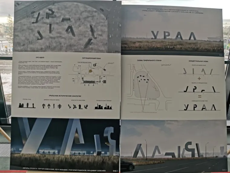 Архитекторы Петр Любавин и Григорий Родионов, глава Музея истории Екатеринбурга Сергей Каменский и художник Владимир Селезнев предлагаю установить перед аэропортом слово УРАЛ