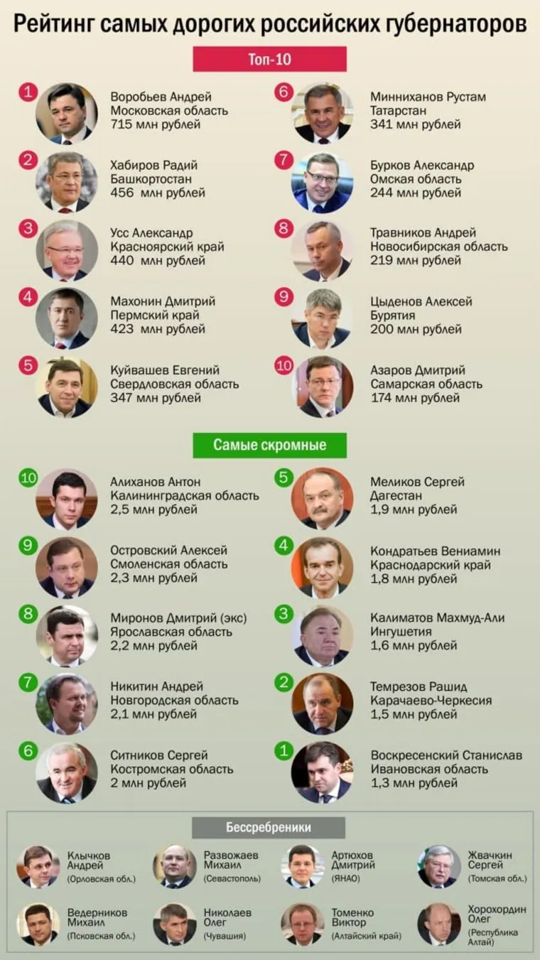 «В топе рейтинга самых „дорогих“ начальников преобладают главы богатых республик и еще ряда крупных регионов, особенно на Урале и в Сибири. Лидерство подмосковного губернатора Воробьева выглядит несомненным, поскольку на следующего за ним главу Башкирии Хабирова ушло „всего“ 456 млн рублей. Почетное третье место занял опытный глава Красноярского края Усс, за которым вплотную следовал новый губернатор Пермского края Махонин. Более чем в 300 миллионов рублей обошлось налогоплательщикам содержание его свердловского соседа Куйвашева», — говорится в исследовании.