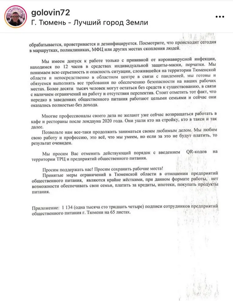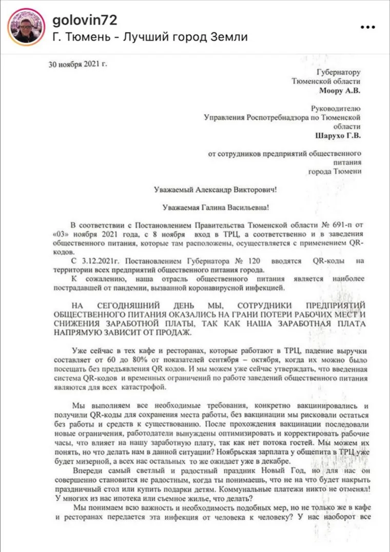 Тюменские предприниматели написали обращение губернатору региона Александру Моору с просьбой отменить QR-коды о вакцинации от коронавируса в ТРЦ и отдельно стоящих заведениях общепита. Об этом на своей странице в Instagram (деятельность запрещена в РФ) рассказал владелец небольшой ресторанной сети быстрого питания Павел Головин. По его словам, в противном случае лишиться работы могут более 10 тыс. жителей Тюменской области, занятые в сфере общественного питания.
