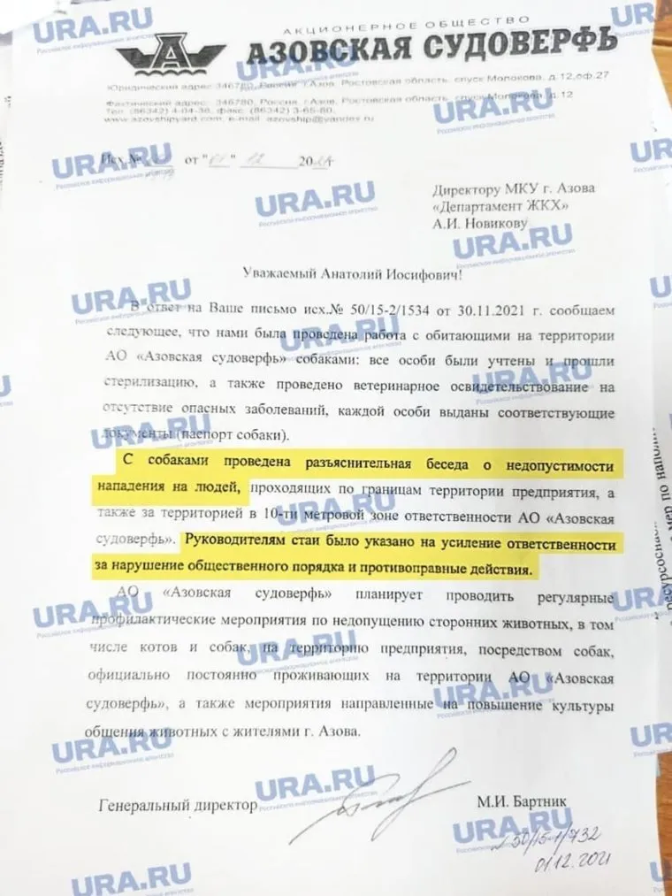 Ранее в социальных сетях появилось письмо Бартника директору местного департамента ЖКХ. В нем он отчитывается о том, что с собаками были проведены «разъяснительные беседы», а «руководителям стаи было указано на усиление ответственности за нарушение общественного порядка и противоправные действия».