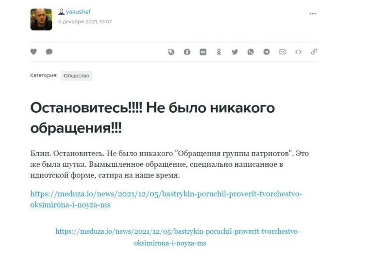 «Блин. Остановитесь. Не было никакого „Обращения группы патриотов“. Это же была шутка. Вымышленное обращение, специально написанное в идиотской форме, сатира на наше время», — написал Дмитрий Якушев на своей странице в «Живом журнале».