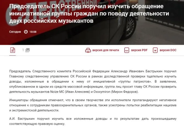По данным СК РФ, обращение к Бастрыкину составила инициативная «группа патриотов». Его авторы заявили, что в своем творчестве Oxxxymiron и Noize MC пропагандируют «негативное отношение к сотрудникам правоохранительных органов». Также они якобы обнаружили в треках рэперов «попытки реабилитации нацизма и экстремистской деятельности».
