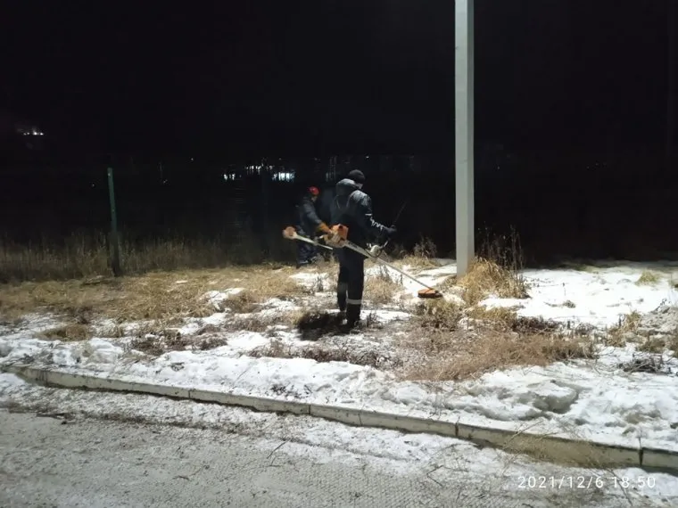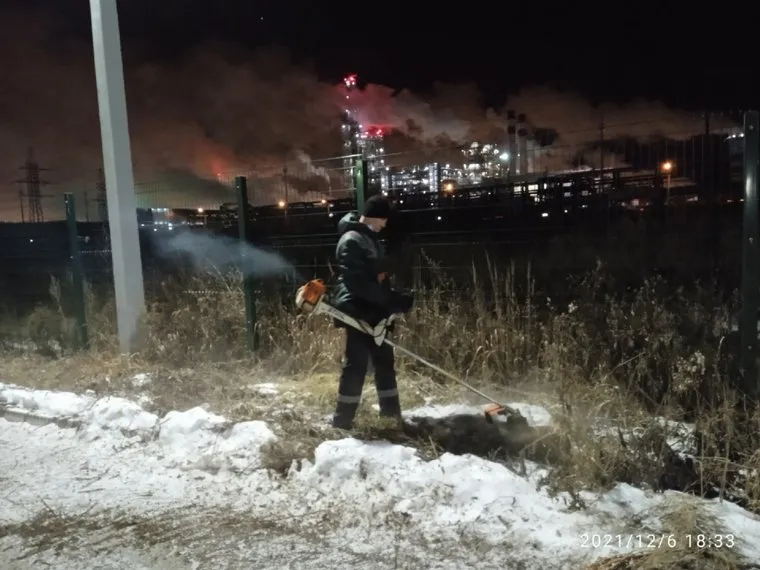Рабочие «Сибура» с мотокосилками боролись с зарослями травы на территории предприятия в -20