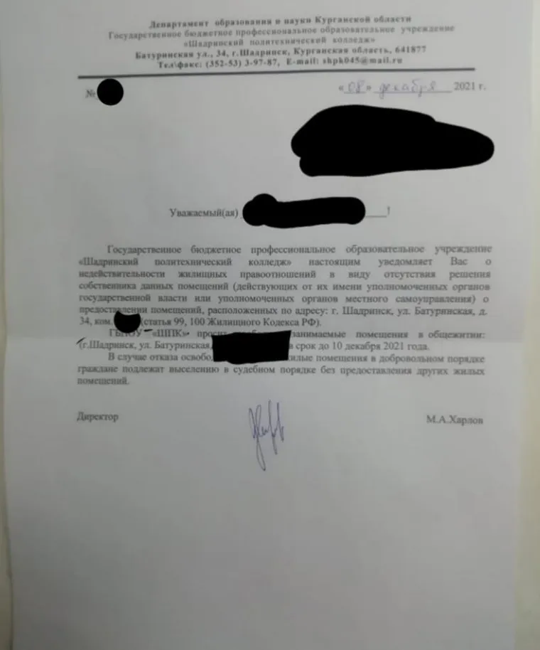 Такое уведомление в 2020 году получили некоторые семьи, проживающие в общежитии Шадринского политехнического колледжа