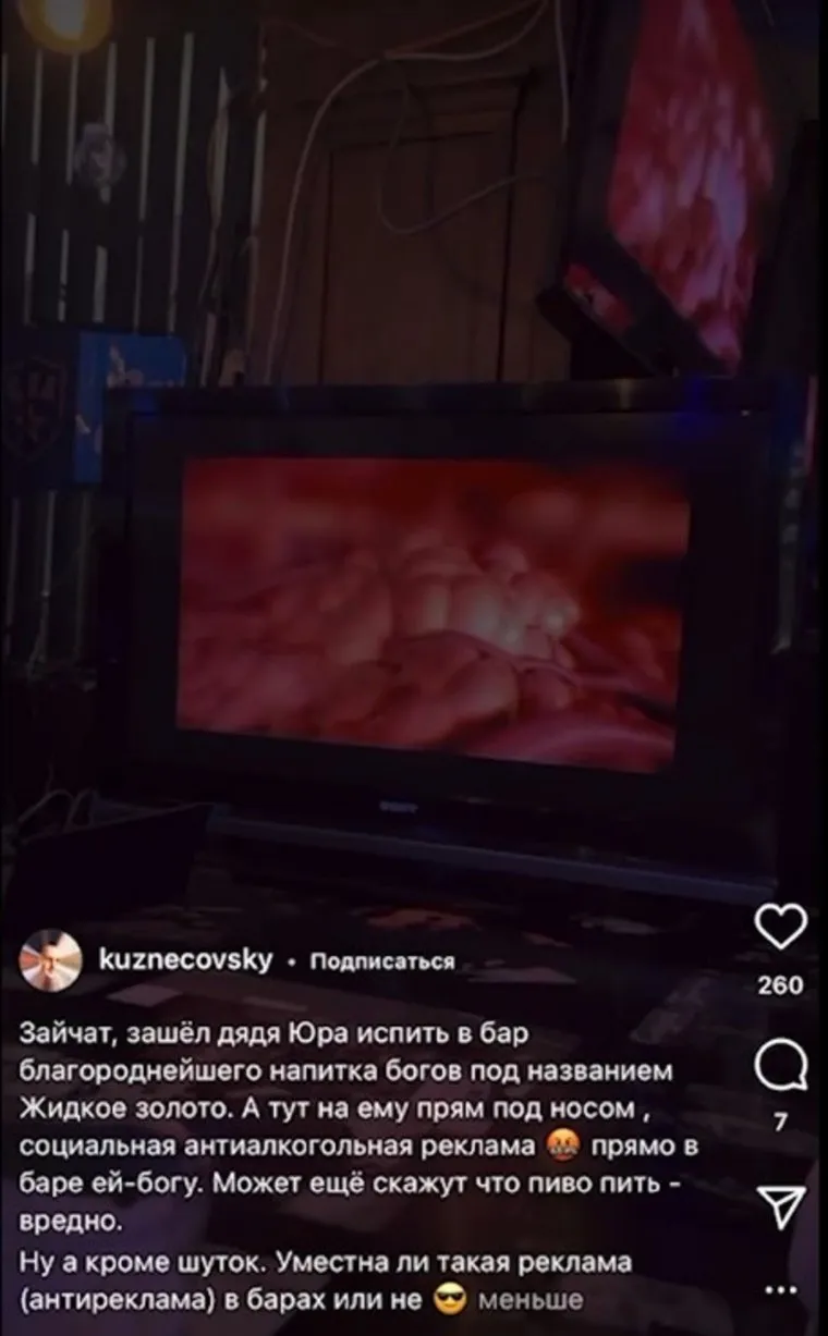 В одном из баров Санкт-Петербурга посетителям демонстрируют видеоролики о вреде алкоголя. На это обратили внимание блогеры Юрий Кузнецов и Иван Медведев, которые решили посетить заведение вечером пятницы. Фрагмент видеоролика о вреде алкоголя они выложили в своих социальных сетях.
