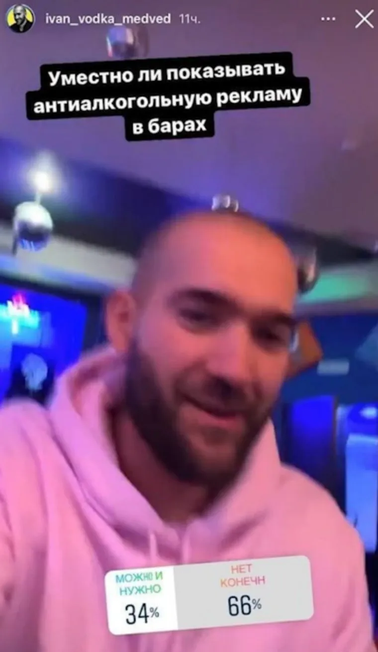 «Юрий очень негодует. Ему показывают антиалкогольную рекламу в баре», — написал в сторис в своем instagram (деятельность запрещена в РФ)-аккаунте Иван Медведев.