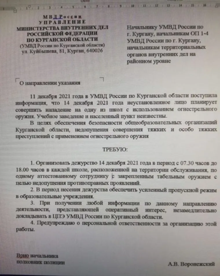 «В УМВД по Курганской области поступила информация, что 14 декабря неустановленное лицо планирует совершить нападение на одну из школ с использованием огнестрельного оружия. Учебное заведение и населенный пункт неизвестны», — говорится в копии документа за подписью врио начальника УМВД по Курганской области Александра Воронежского.