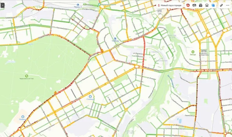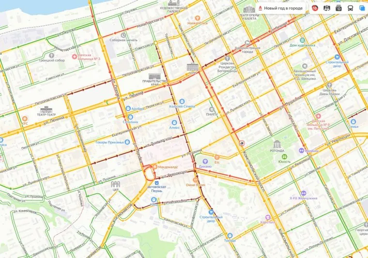 Пермь встала в пробки. Сервис «Яндекс.Пробки» на 18:20 оценивает загруженность городских дорог в максимальные 10 баллов.
