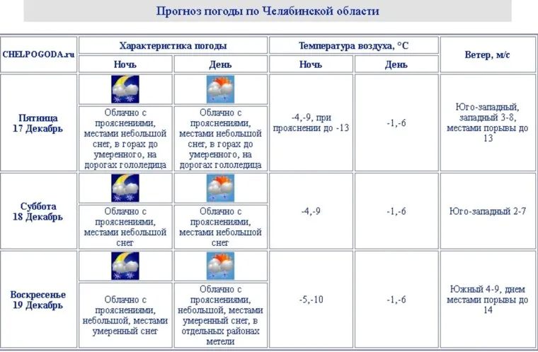 «В пятницу, 17 декабря, в Челябинской области ожидается облачная погода с прояснениями. Местами небольшой снег, в горах до умеренного, на дорогах гололедица. Снежная погода сохранится также 18 декабря и в ночь на воскресенье. Однако днем 19 декабря порывы ветра будут достигать 14 метров в секунду, в отдельных районах возможны метели», — пояснили URA.RU в челябинском гидрометцентре.