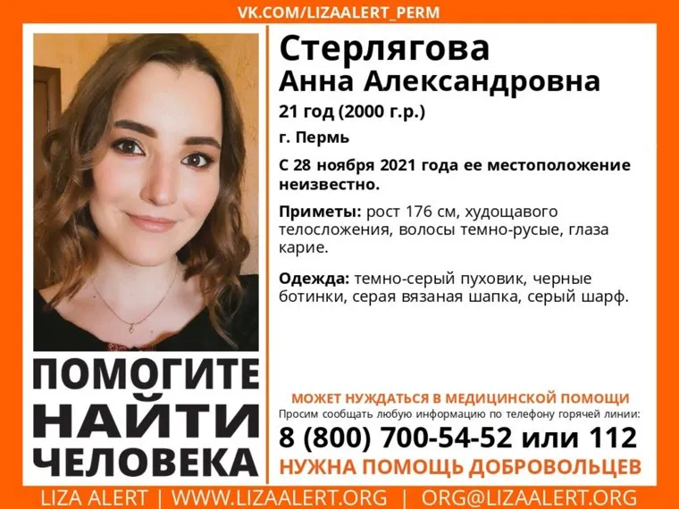 «Стерлягова Анна Александровна может находиться в нашем регионе», — говорится в сообщении, опубликованном в группе поискового отряда в соцсети «ВКонтакте». Она пропала с 28 ноября и может нуждаться в медпомощи.