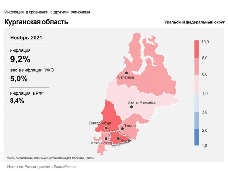 «В ноябре 2021 года годовая инфляция в Курганской области замедлилась на 0,10 п. п., до 9,23%. При этом инфляция оставалась выше, чем в Уральском федеральном округе (7,24%) и по России в целом (8,40%)», — рассказали в пресс-службе.