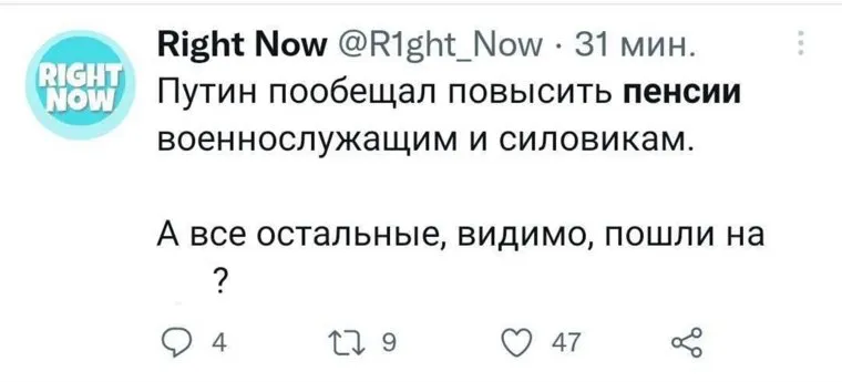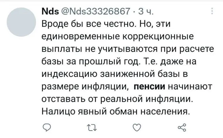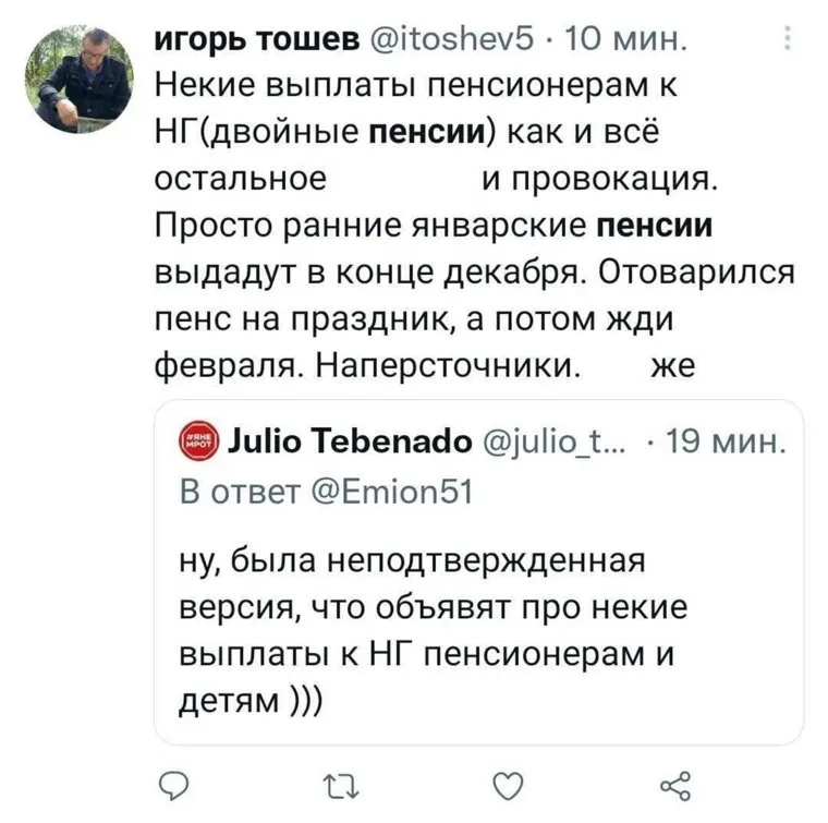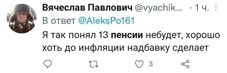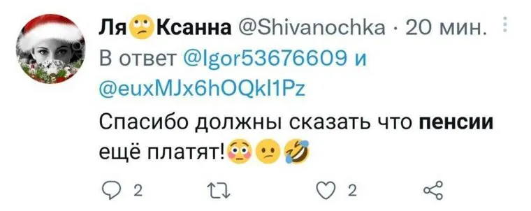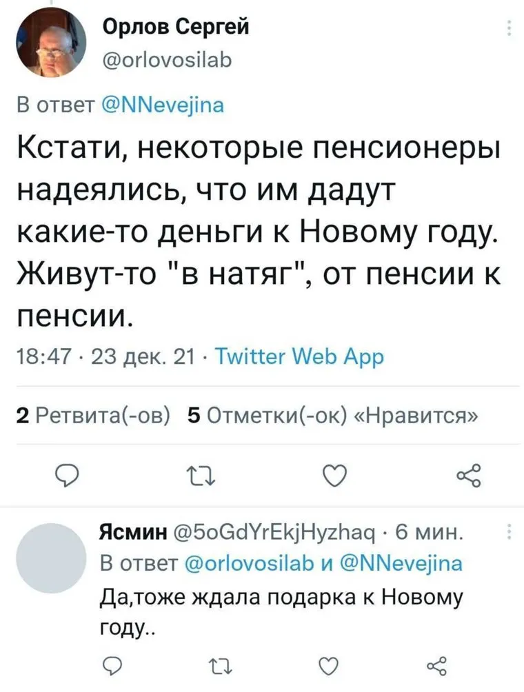 Однако в ходе сегодняшней итоговой пресс-конференции Путин не стал обещать дополнительные выплаты пенсионерам к Новому году. Вместо этого он сообщил, что страховая пенсия будет проиндексирована по уровню фактической инфляции. Глава государства призвал правительство РФ сделать все, чтобы выполнить «обещания прошлых лет». Такая «замена» расстроила пользователей Twitter.