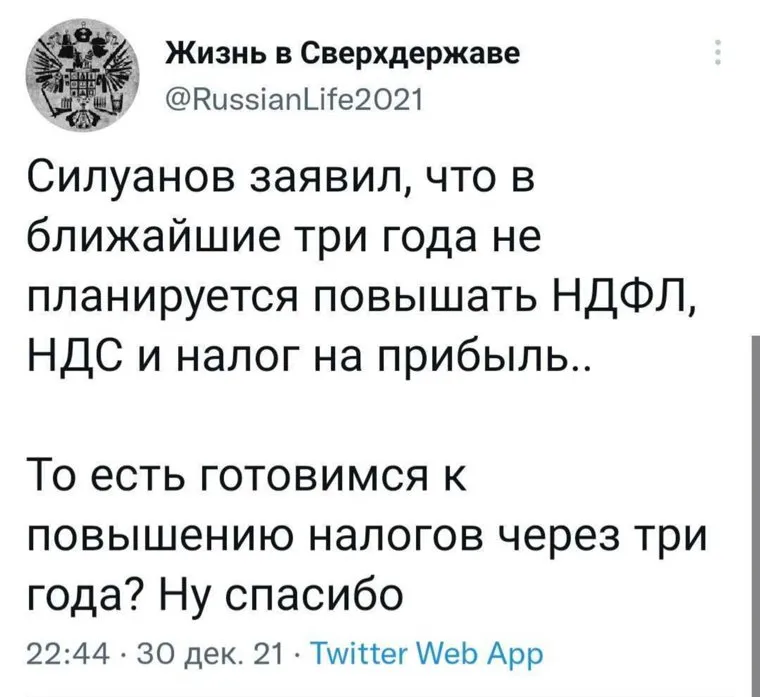 Пользователи соцсетей не поверили заявлению главы Минфина РФ Антона Силуанова о том, что ведомство не планирует повышать ставки НДФЛ, НДС и налога на прибыль в ближайшие три года. Многие считают, что правительство введен новые налоги в случае, если не будет повышать вышеперечисленные.