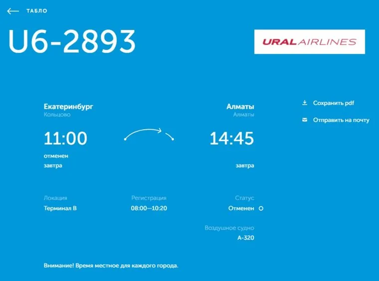 В Екатеринбурге отменяют авиарейсы до Казахстана. Скрин