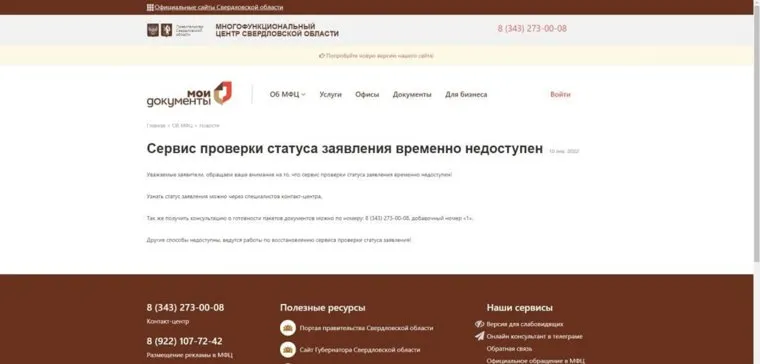 В многофункциональных центрах (МФЦ) Свердловской области произошел сбой программного обеспечения, из-за этого невозможно проверить статус заявления онлайн. Об этом сообщается на сайте МФЦ Свердловской области.
