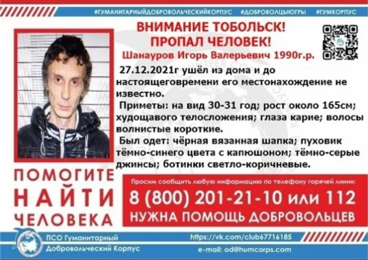 «Шанауров Игорь Валерьевич 1990 года рождения. 27.12.2021 ушел из дома, до настоящего времени его местонахождение не известно. Приметы: на вид 30-31 год; рост около 165 см; худощавого телосложения; глаза карие; волосы волнистые короткие», — говорится в ориентировке.