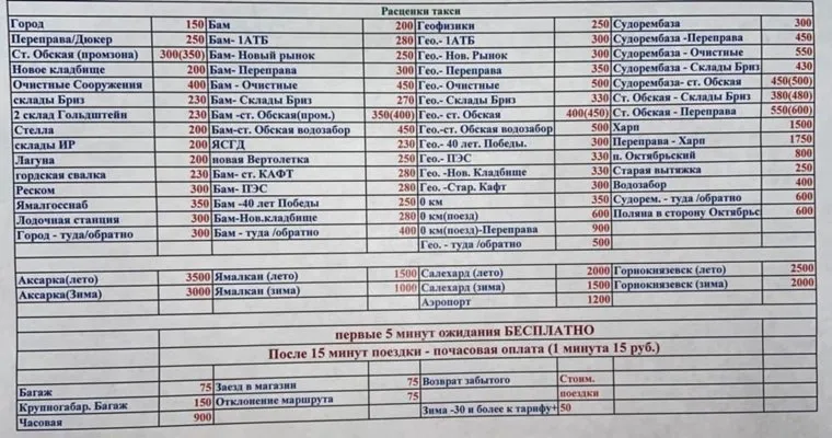 «Уважаемые горожане, доводим до вашего сведения, что с 01.01.2022 года, стоимость проезда в такси изменилась, по городу 150 рублей. С остальными расценками можете ознакомиться в прикрепленном файле. Отнеситесь к данному повышению цен с пониманием. С уважением, ваши многочисленные водители», — написал анонимный таксист в «Подслушано №1 Лабытнанги», приложив к записи фото с расценками на поездки.