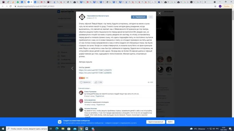 - гномики подземные17 января 2022 00:19Ужаснейший фоторобот. По этому фото можно поймать только Воландеморта. А сам случай - почему нельзя схватить по горячим следам или даже ликвидировать? Трупов ждете? Пересидок явно орудует, зачем вы их выпускаете, правоохранители. К слову - там не только жен и детей, мужчин тоже лучше сопровождать, нормальные мужчины от пересидков тоже постоянно страдают не меньше женщин и в группе риска как жертвы.
