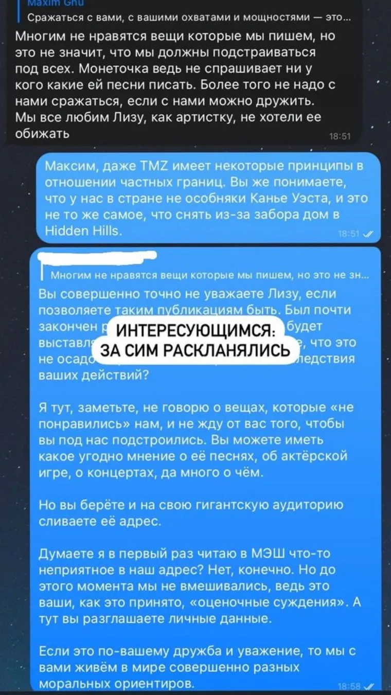 «Многим не нравятся вещи которые мы пишем, но это не значит, что мы должны подстраиваться под всех. Монеточка ведь не спрашивает ни у кого, какие ей песни писать. Более того не надо с нами сражаться, если с нами можно дружить. Мы все любим Лизу, как артистку, не хотели ее обижать», — ответил Иксанов.