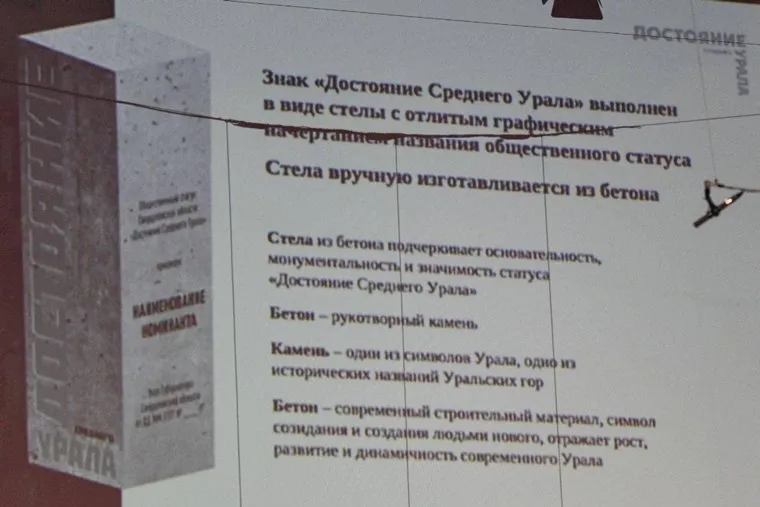«Знак „Достояние Среднего Урала“ выполнен в виде стелы с отлитым графическим начертанием названия общественного статуса. Стела вручную изготавливается из бетона. Бетон — рукотворный камень. Камень — один из символов Урала», — сообщил во время торжественного мероприятия председатель Общественной палаты Свердловской области Александр Левин.