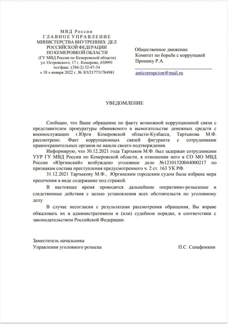 «Перед новым годом, 31 декабря, Тартыкову избрали меру пресечения в виде содержания под стражей. Также в отношении него возбудили уголовное дело по признакам состава преступления, предусмотренного ч. 2 ст. 163 УК РФ (Вымогательство). Такая информация содержится в ответе ГУ МВД России по Кемеровской области на наше обращение», — рассказал Роман Пронин.