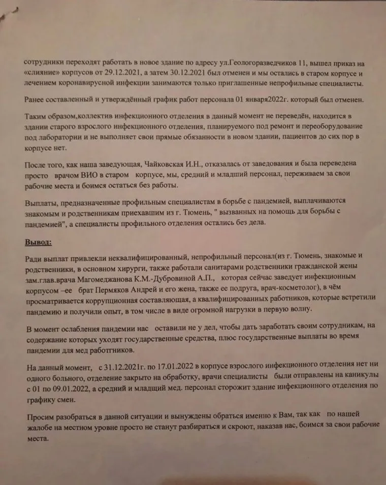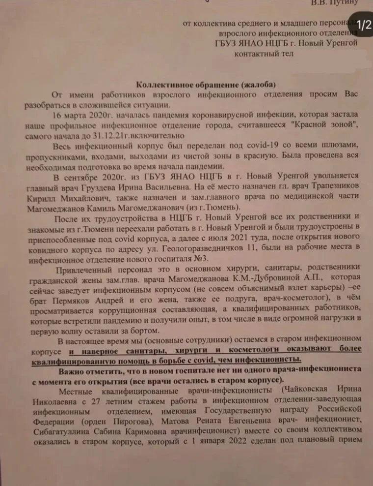 «От имени работников взрослого инфекционного отделения просим Вас разобраться в сложившейся ситуации. В сентябре 2020 года главным врачом назначили Кирилла Трапезникова, замглавного врача стал Камиль Mагомеджанов (Тюмень). Все их родственники и знакомые из Тюмени переехали работать в Новый Уренгой и были трудоустроены в инфекционное отделение нового госпиталя №3. Привлеченный персонал — это родственники гражданской жены зам. главврача — Дубровиной, которая заведует инфекционным корпусом, в чем просматривается коррупционная составляющая. А квалифицированных работников оставили за бортом. В настоящее время мы остаемся в старом инфекционном корпусе и наверное санитары, хирурги, косметологи оказывают более квалифицированную помощь в борьбе с covid, чем инфекционисты», — говорится в жалобе медиков, которую они разослали в группах (орфография сохранена).