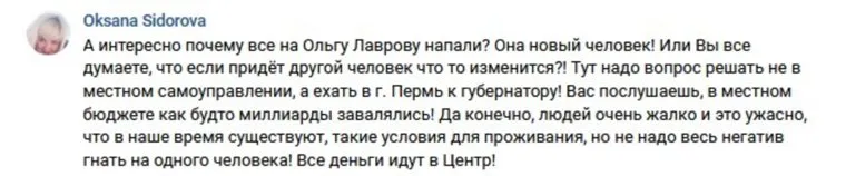 Жители Александровска (Пермский край) призвали главу округа Ольгу Лаврову уйти в отставку после вышедшей на «Первом канале» программы «Мужское и женское». Ее героями стали жильцы аварийных домов, расположенных по улице 3-го Интернационала. Лаврова участвовала в ток-шоу по видеосвязи. В соцсети «Вконтакте» на мэра обрушился шквал критики.