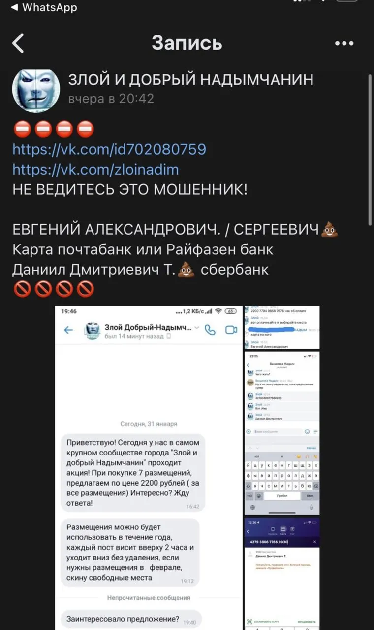Сразу три популярных ямальских группы в соцсети «ВКонтакте» — «Злой и добрый надымчанин», «Подслушано в Салехарде» и «Лабытнанги Info» заявили о действиях мошенников от имени их сообществ. Как сообщают администраторы пабликов, аферисты предлагают купить в группах рекламу и отправляют свои реквизиты для перевода денег.