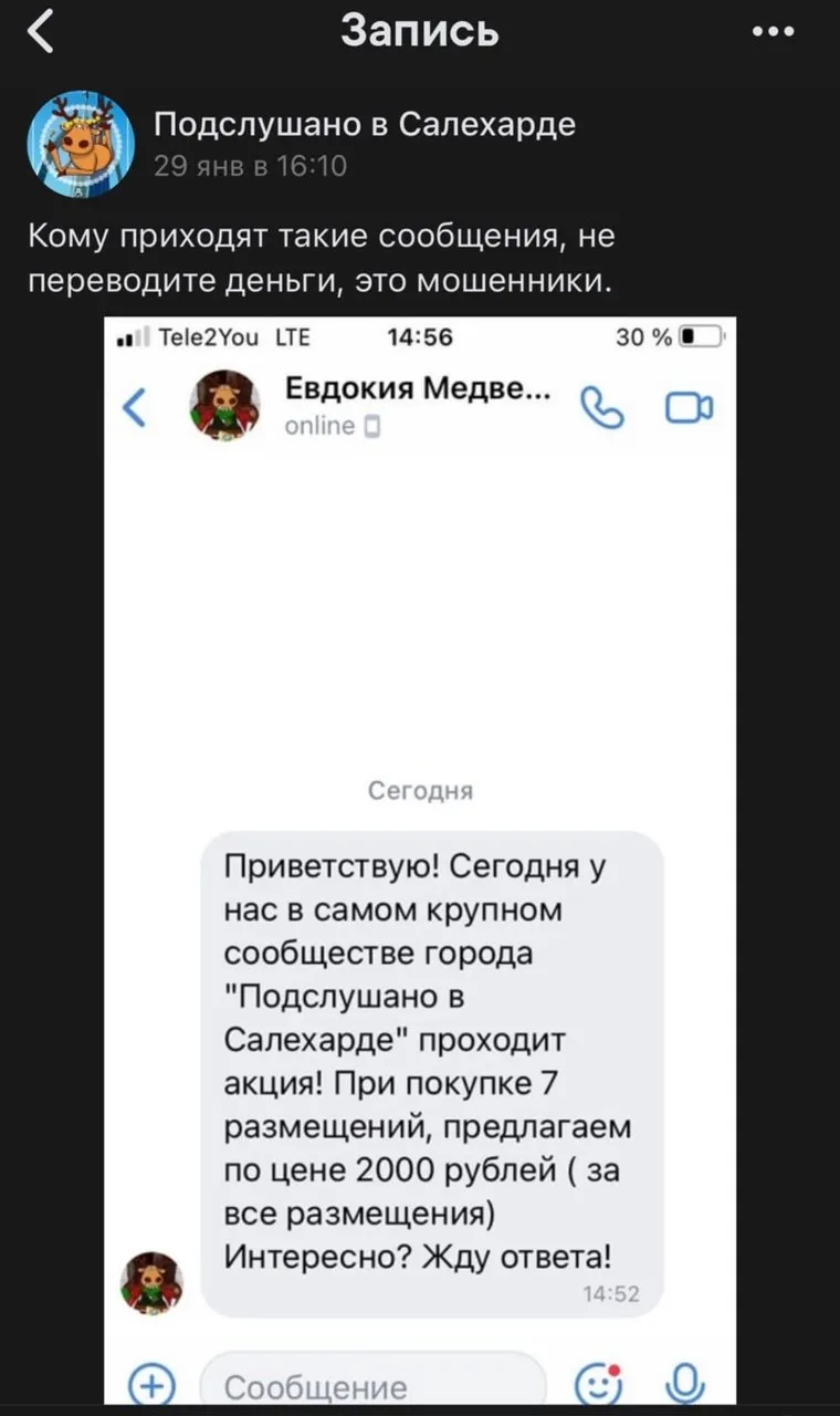 «К нам приходят такие сообщения. Не переводите деньги, это мошенники», — написал администратор «Подслушано в Салехарде». Аферисты отправляют одинаковые сообщения, якобы предлагают купить семь размещений в паблике по акции за две тысячи рублей.