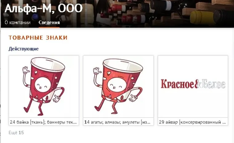 Товарный знак в виде танцующего стакана зарегистрировало ООО «Альфа — М», один из ключевых активов алкосети «Красное и Белое». Соответствующая запись была внесена в реестр 20 января, следует из данных сервиса СБИС.