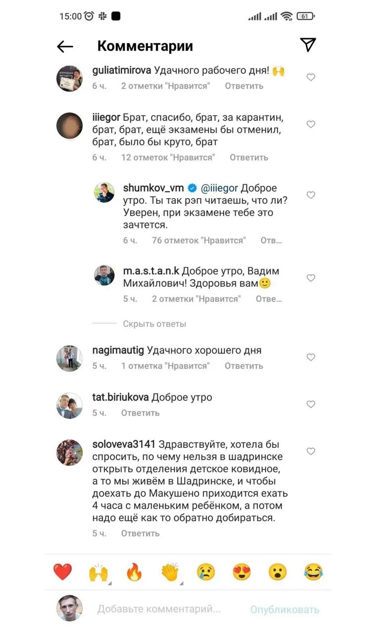 «Брат, спасибо, брат, за карантин, брат. Брат, еще экзамены бы отменил, брат. Было бы круто, брат», — написал пользователь iiiegor под постом в instagram (деятельность запрещена в РФ)-аккаунте Шумкова.
