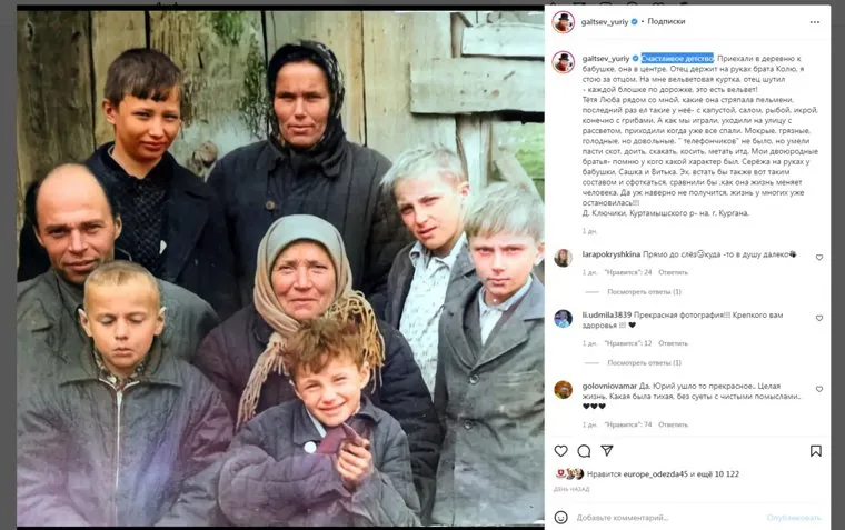Актер и юморист Юрий Гальцев, уроженец Кургана, опубликовал на своей странице в Instagram (деятельность запрещена в РФ) детское семейное фото. Он объяснил, что снимок сделан в деревне Ключики Куртамышского района, где жила его бабушка.